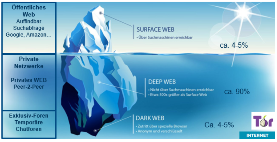 Beginnen wir mit dem Bereich, der oberhalb des Eisbergs liegt. Da dieser an der Oberfläche (engl. Surface) liegt, bezeichnet man diesen Teil auch als Surface-Web. Das Surface-Web umfasst alles, was wir täglich im Internet nutzen, z. B. Google, YouTube, Wikipedia, Amazon und all das, was man generell durch den Aufruf eines Links erreichen kann. Mit Suchmaschinen kann man Seiten in diesem Teil des Internets aufspüren. Dieser Teil des Internets macht nur ca. 4-5% des Internets aus. Diese Zahl weicht je nach Quelle ab, doch im Groben kann man von einem einstelligen Prozentbereich ausgehen. Um auf das Surface-Web zugreifen zu können, benötigt man einen Rechner, eine Internet-Verbindung und einen einfachen Browser. Es sind also keine speziellen Programme notwendig.