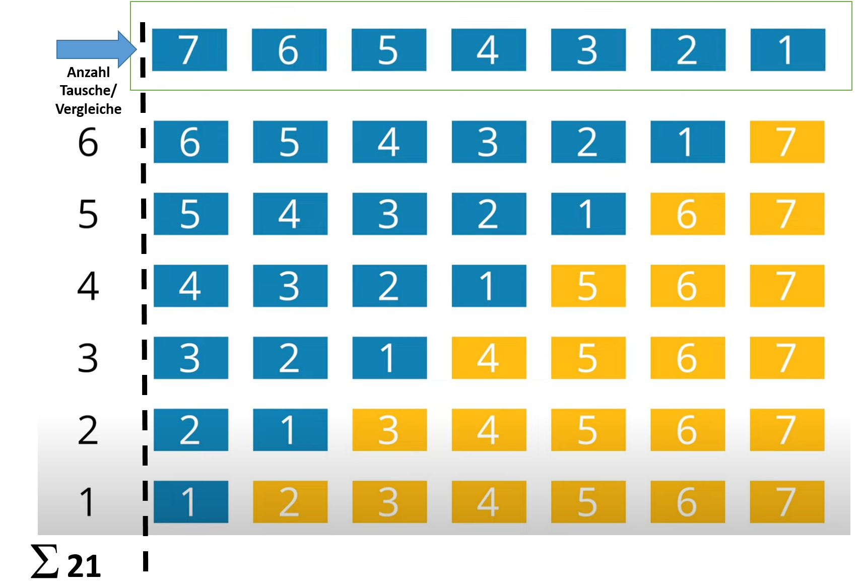 Im obigen Beispiel sind 21 Vergleiche/Tausche notwendig, um die Zahlenreihe einmal umgekehrt aufsteigend zu sortieren.
