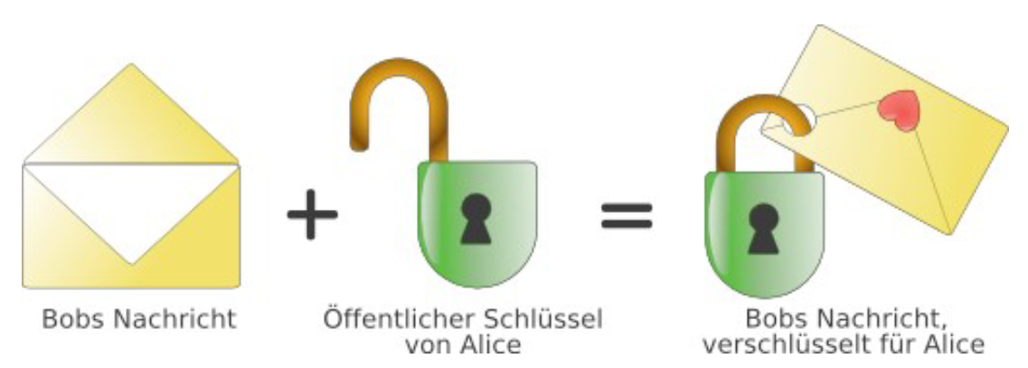 Nehmen wir nun an, Bob möchte eine Nachricht an Alice schicken. Alice will aber verhindern, dass ihr Vater lesen kann, was Bob und andere Freunde so alles schreiben. Dazu wird sie also als Erstes einige Schlösser anfertigen, die nur von einem (nämlich ihrem) Schlüssel geöffnet werden können. Dann wird sie ihre (offenen!) Schlößer an ihre Freunde verteilen, also auch an Bob.