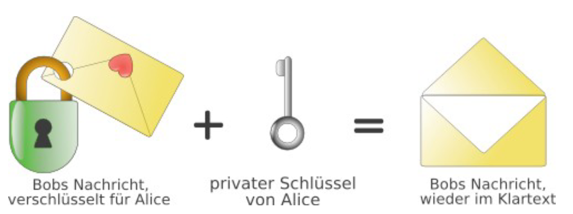 Bob hat nun ein offenes Schloß von Alice, welches er zwar schließen kann, aber ohne passenden Schlüssel nicht wieder zu öffnen vermag (Alice darf ihren Schlüssel natürlich auf keinen Fall bekannt geben). Also fängt Bob an, seinen Brief zu schreiben, steckt ihn in eine Kiste und verschließt diese mit dem Schloss von Alice. Abgesehen von Alice ist nun niemand mehr in der Lage, die Kiste zu öffnen und den Brief zu lesen. Die Kiste macht sich nun auf die Reise und erreicht irgendwann Alice, welche mit ihrem Schlüssel das Schloss öffnet, den Brief der Kiste entnimmt, liest und froh ist, dass ihr Vater Bobs Brief nicht lesen konnte.